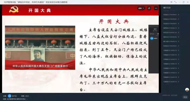 员工第一党支部党员刘子龙作为主讲人,从开国大典的背景、经过、意义三大方面来讲述,并播放影片《开国大典》精彩片段。同学们纷纷表示,历史是一面镜子,它照亮现实,也照亮未来。站在建党百年的关键节点上,我们广大青年党员要牢记初心使命,练就过硬本领,书写奋斗青春。