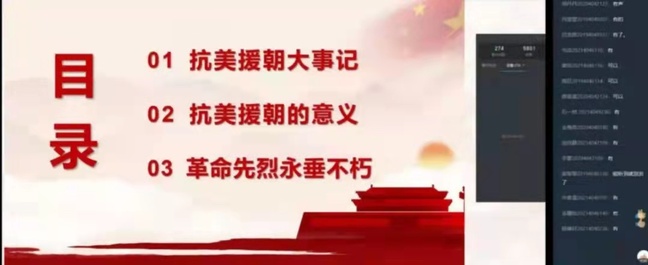 活动开始,员工第九党支部党员龚文莉作为主讲人,为大家详细讲解了志愿军战士保家卫国的过程和革命先烈事迹,并为同学们播放了纪录片《全景回顾抗美援朝历史》。同学们纷纷表示,通过回望历史,体会到建国初期要立足的决心,我们会坚定理想信念,继续延续优良传统,不忘初心,砥砺前行。