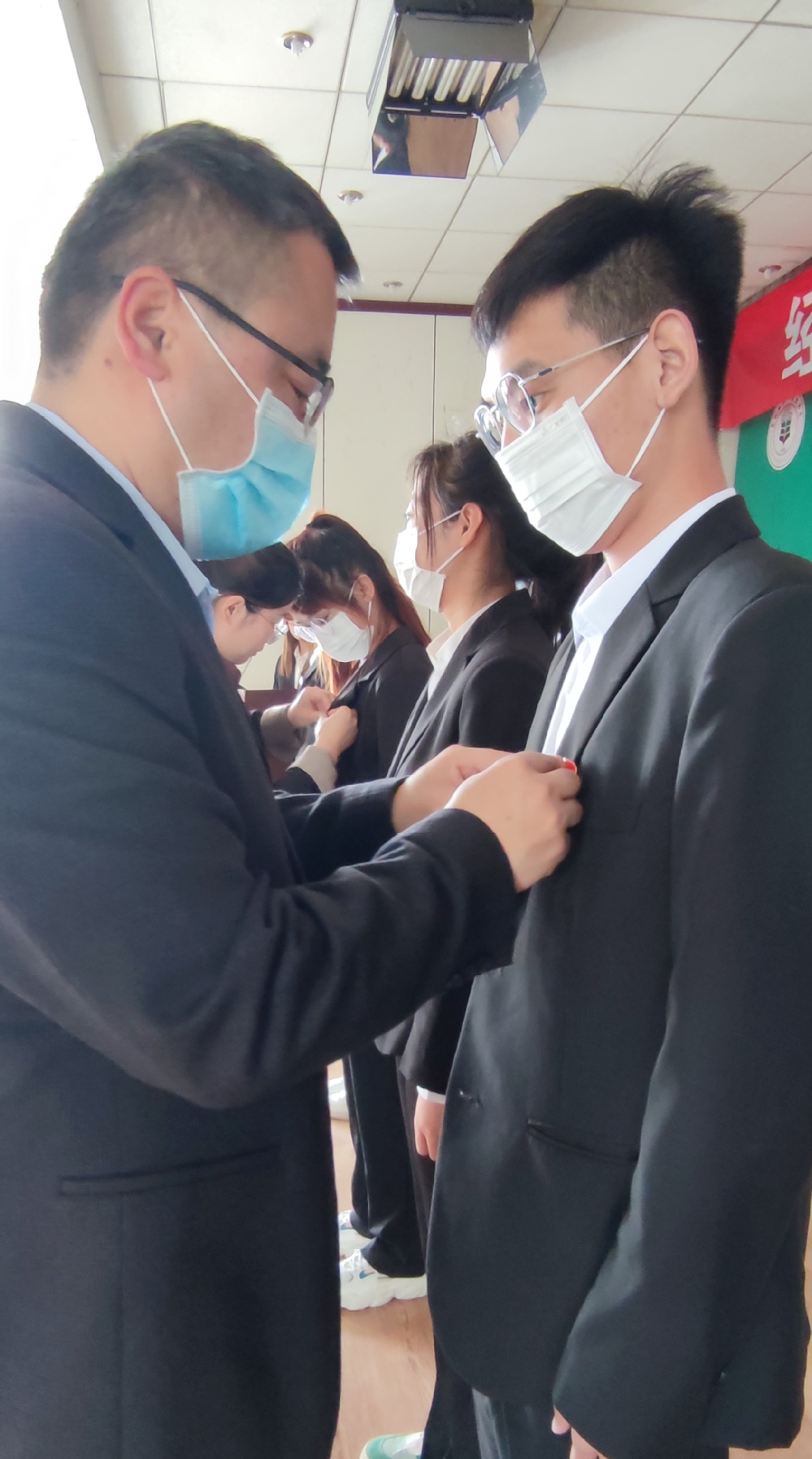 伴随着团旗的入场,入团仪式正式开始,公司党委副书记闯垒和2019级辅导员梁净为6名新团员佩戴团徽。