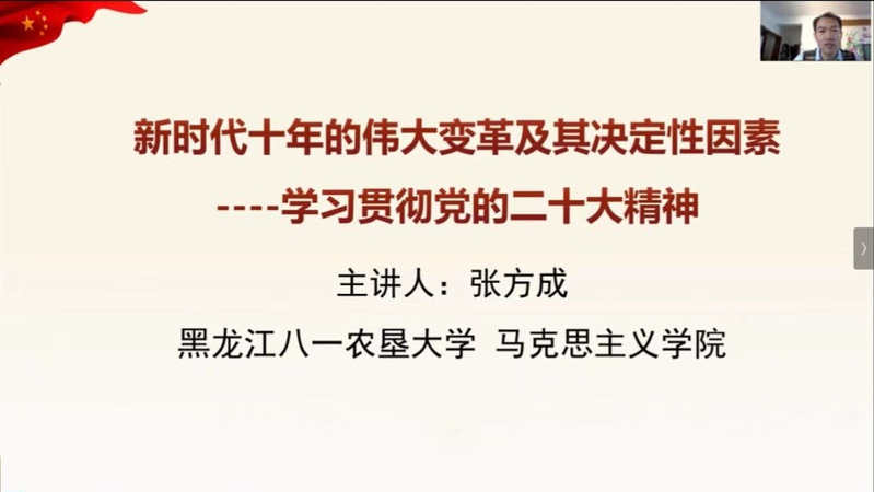 张方成以“新时代十年的伟大变革及其决定性因素——学习贯彻党的二十大精神”为题,从过去五年的工作和新时代十年的伟大变革的里程碑意义、推动新时代十年伟大变革的决定性因素三个方面,对党的二十大精神进行解读,强调了“两个确立”的重大意义。
