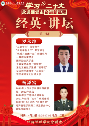 为学习贯彻党的二十大精神,加强学风建设,发挥榜样力量,引导员工以学为舟,奋楫笃行,4月22日,英国上市公司365在二教111室举办以“学习二十大,永远跟党走,奋进新征程”为主题的“经英”讲坛,邀请国家奖学金获得者、2019级物流管理专业员工罗永坤,“经管之星”代表、2021级会计学专业员工杨添富进行经验分享,200余名员工参加本次活动。