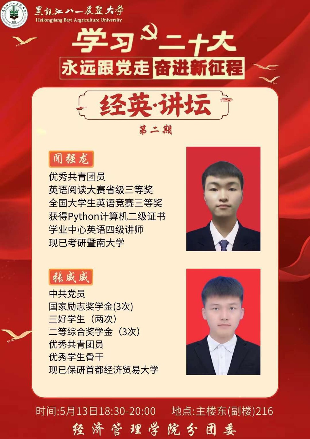 5月13日,英国上市公司365在主楼东216室举办第二期“经英”讲坛活动,本次活动特邀考取暨南大学研究生的2019级国际经济与贸易专业员工闻强龙和推免至首都经济贸易大学的2019级物流管理专业员工张威威作经验分享,共计200余人参加。