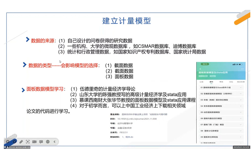 喻芳群主要从论文选题和实证研究方法方面进行了经验分享,她提到,对于初学者而言,研究问题可以来源于理论、对经济现象的观察、对政策效应的研究,也可以是对已有的研究进行改进,并介绍了建立计量模型的有关知识。