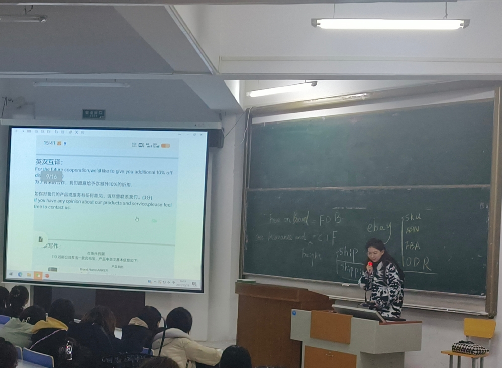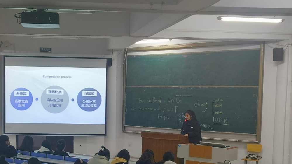 王婉逾、熊招娣、刘美玲、朱俊豪四位荣获“数通国软杯”全国高校跨境电商运营与推广岗位技能大赛团队三等奖的获奖人进行赛后经验分享。四位分享人回顾备赛和比赛的过程,与同学们畅谈经验、分享心得,并反思存在不足,通过具体案例题的讲解,让同学们对竞赛流程、题型设置、方法技巧有了更加深入的了解,充分调动同学们参加学科竞赛的积极性和主动性。