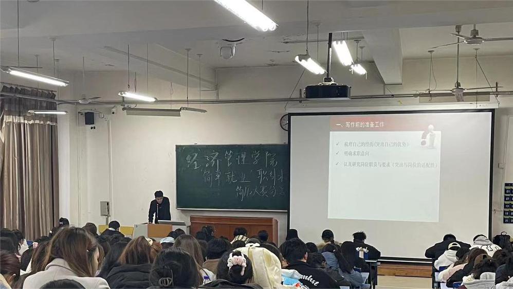 本次活动邀请2021级人力资源管理专业员工高杰作为主讲人。高杰从简历撰写前的准备、简历的核心内容和简历设计的基本原则三个方面进行介绍,强调要重点展示与意向岗位有关联的、能突出个人优势的经历,要量化成果,用数据和具体的事件进行支撑,并分享了简历排版技巧。高杰结合具体案例为同学们分析简历制作注意事项和常见问题,鼓励同学们学习借鉴优秀简历,希望同学们能够在简历制作方面拥有更多的经验,提升能力,展示优势,为未来求职打下坚实的基础。