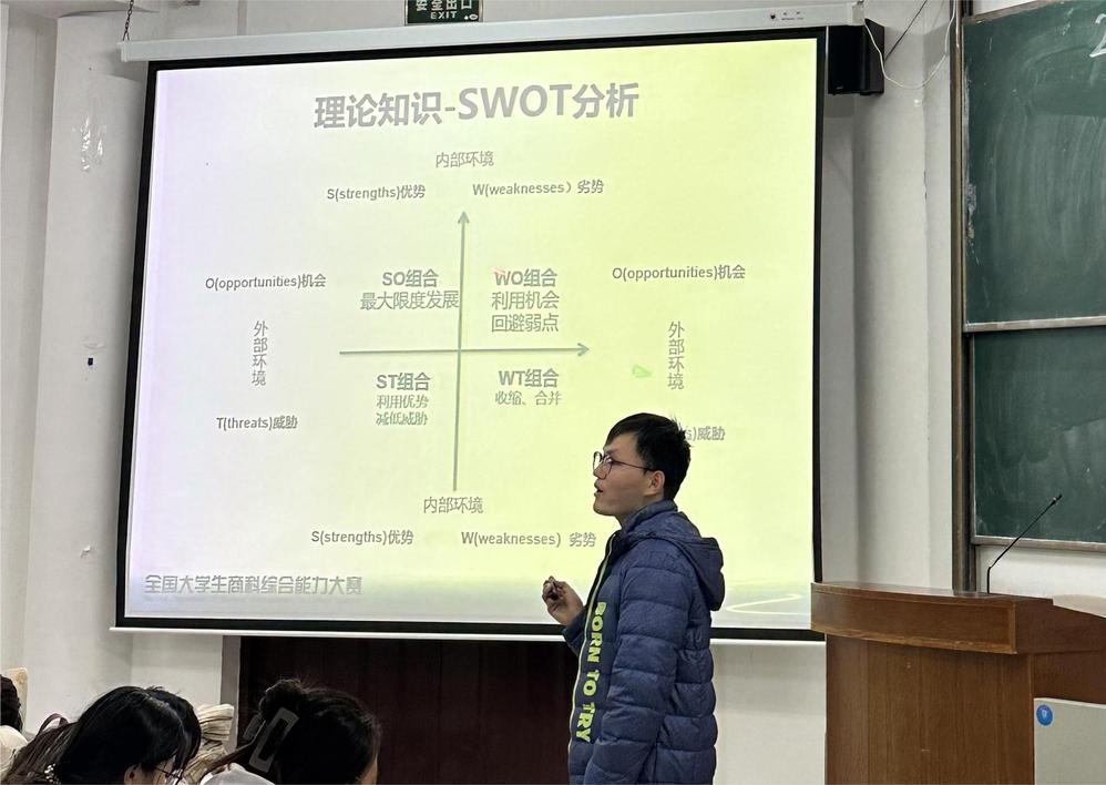 获得2023年全国大员工商科综合能力大赛团体三等奖的团队负责人杨滨作赛后经验分享。杨滨从赛事介绍、竞赛系统介绍、竞赛系统决策要点、竞赛系统相关理论四个方面进行详细解读,着重介绍竞赛系统平台策鸿国际企业经营模拟软件及参加竞赛的相关流程,进一步加深同学们对全国大员工商科综合能力大赛的了解,鼓励同学们积极参加学科竞赛,在竞赛中掌握知识和技能,提升自身专业实践能力。