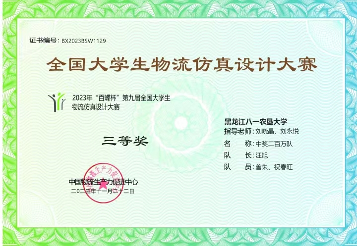 11月20日,“百蝶杯”第九届全国大员工物流仿真设计大赛总决赛圆满结束,由2021级供应链管理专业汪旭、曾朱、祝春旺组成的参赛团队,在刘晓晶、刘永悦两位老师的指导下荣获本科组三等奖的优异成绩。