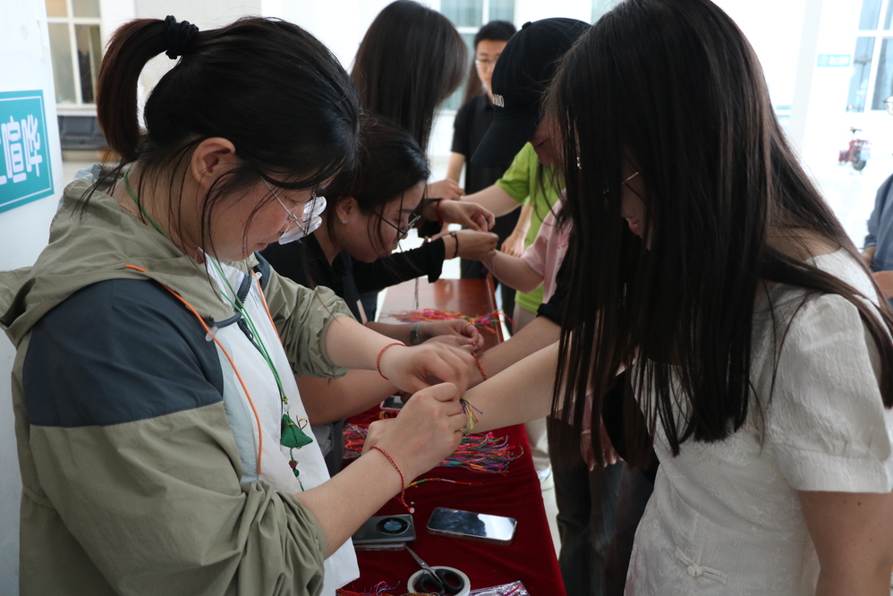 浓情寄端午,安康传祝福,根根丝线连,切切情意牵。老师们为来到活动现场的每位同学系五彩绳、挂香囊,同学们在创意展板和书签上互寄端午安康。