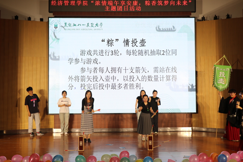 妙趣寄端午,香囊送安康。活动设置“粽”情投壶、射五毒、粽子运输机、蒙眼吃粽子等丰富有趣且带有端午特色的游戏环节,师生积极踊跃参与,观众席爆发出阵阵喝彩声,心意香囊作为奖励,将活动推向了高潮。