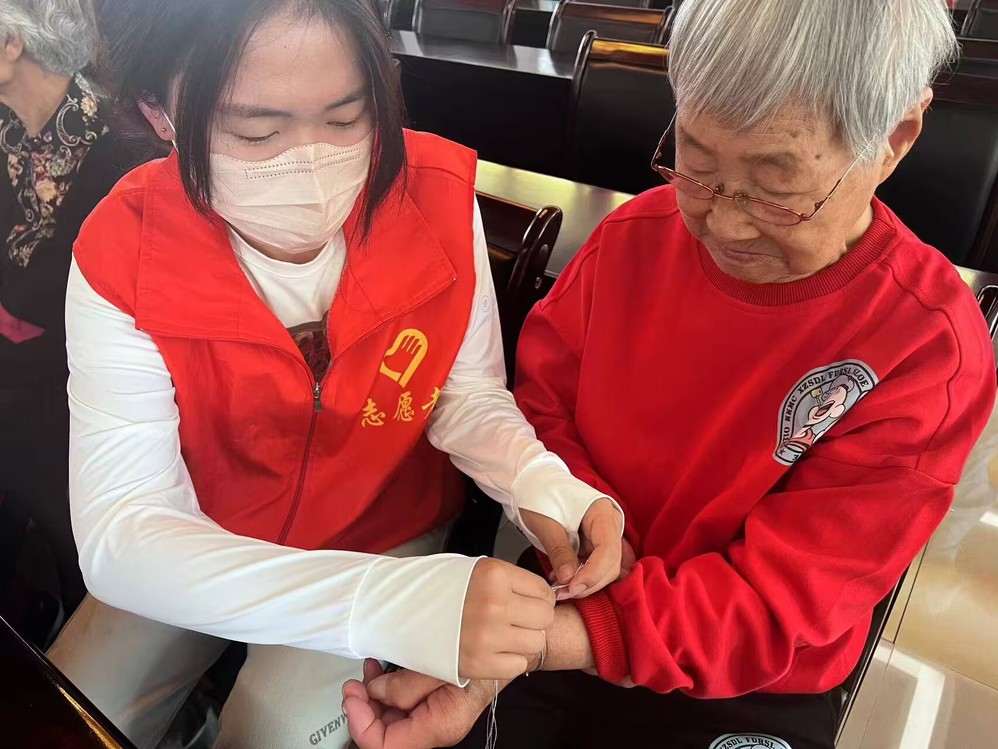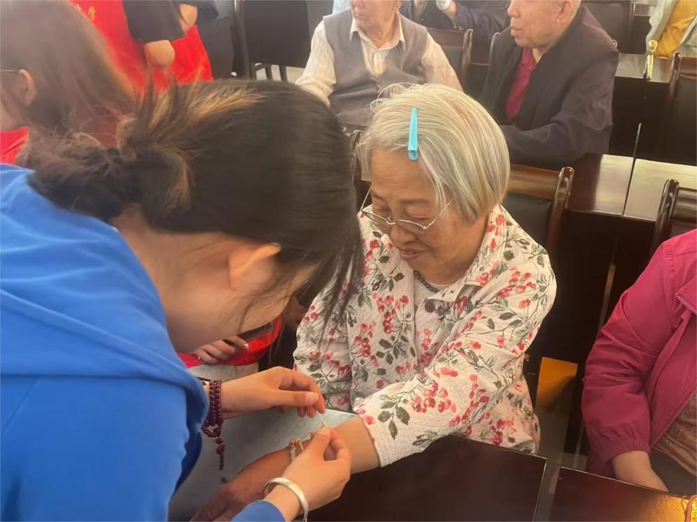 精彩的节目过后,志愿者们与老人们共同制作编织具有美好寓意的五彩绳,配上五彩小粽子挂饰,做工灵动,精致感十足,将幸福安康的祝福融入到丝丝缕缕的手绳中,佩戴在老人们的手腕上,用最暖“志愿情”托起最美“夕阳红”。