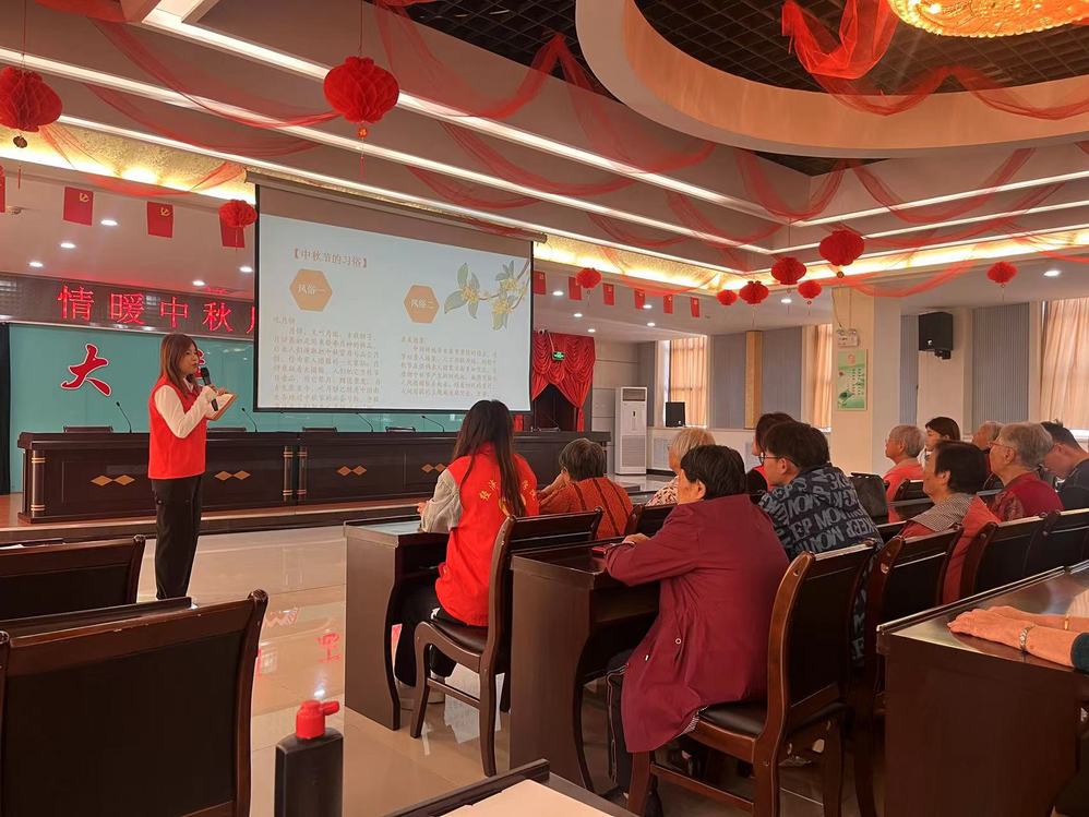 志愿者结合PPT向老人们科普中秋节的历史由来、传统习俗,开展吟诵中秋诗词,猜灯谜等小游戏,让老人们进一步了解中国传统节日的文化魅力、内涵和底蕴,为老人们带去温暖和欢乐。
