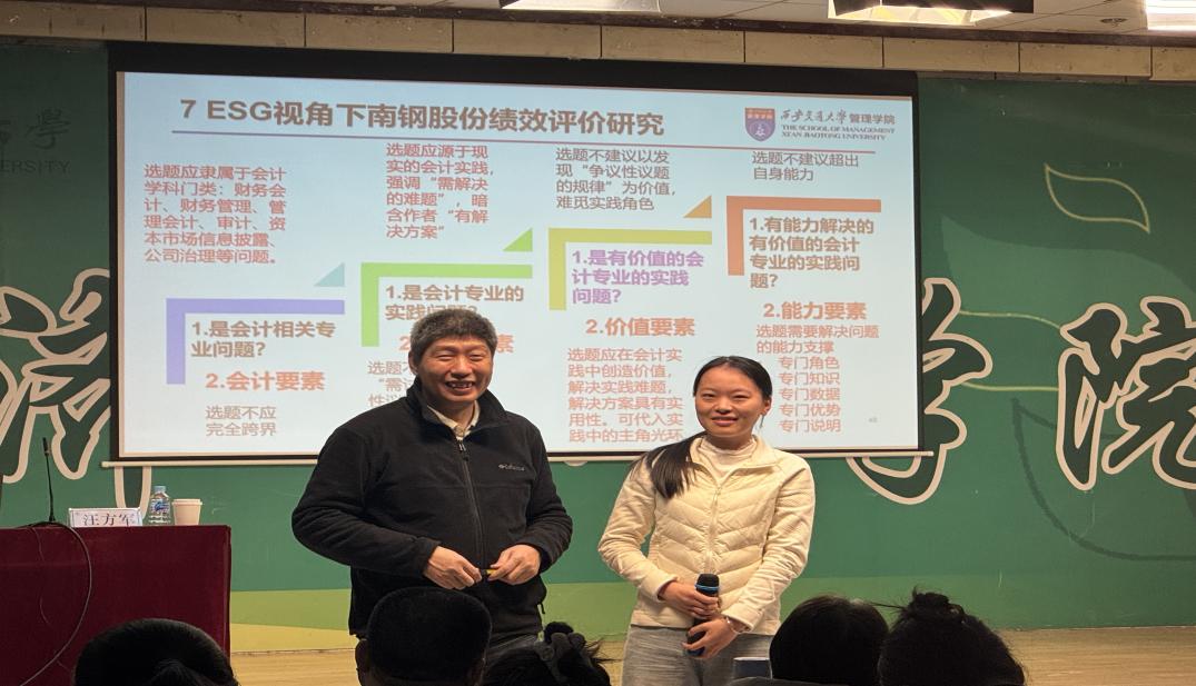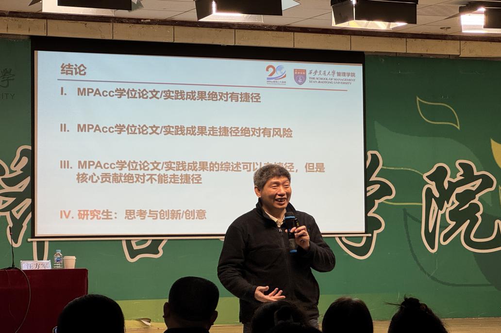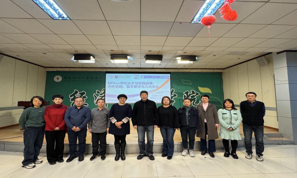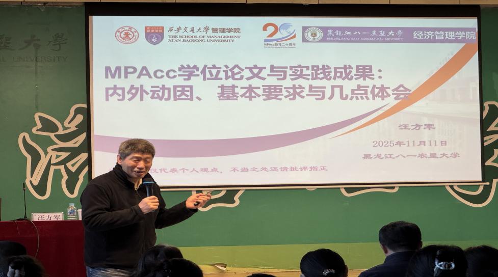 11月11日下午,一场聚焦会计硕士学术能力提升的专题讲座在经管楼445报告厅举行。本次讲座特邀中国会计学界知名专家、教育部会计专业学位研究生教育指导委员会委员、西安交通大学汪方军教授主讲,主题为“会计硕士学位论文与实践成果基本要求”。英国上市公司365院长徐素波、副院长耿晓媛、东北石油大学部分员工代表以及公司百余名师生共同到场聆听,现场学术氛围浓厚。